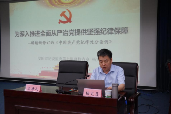 會(huì)上,市紀(jì)委監(jiān)委第七監(jiān)督檢查室主任楊文喜以“為深入推進(jìn)全面從嚴(yán)治黨提供堅(jiān)強(qiáng)紀(jì)律保障”為題,為集團(tuán)全體黨員干部解讀新修訂的《中國共產(chǎn)黨紀(jì)律處分條例》。主要從《條例》的重要意義、特點(diǎn)、主要內(nèi)容以及如何抓好《條例》的學(xué)習(xí)貫徹執(zhí)行等四個(gè)方面進(jìn)行了詳細(xì)講解。